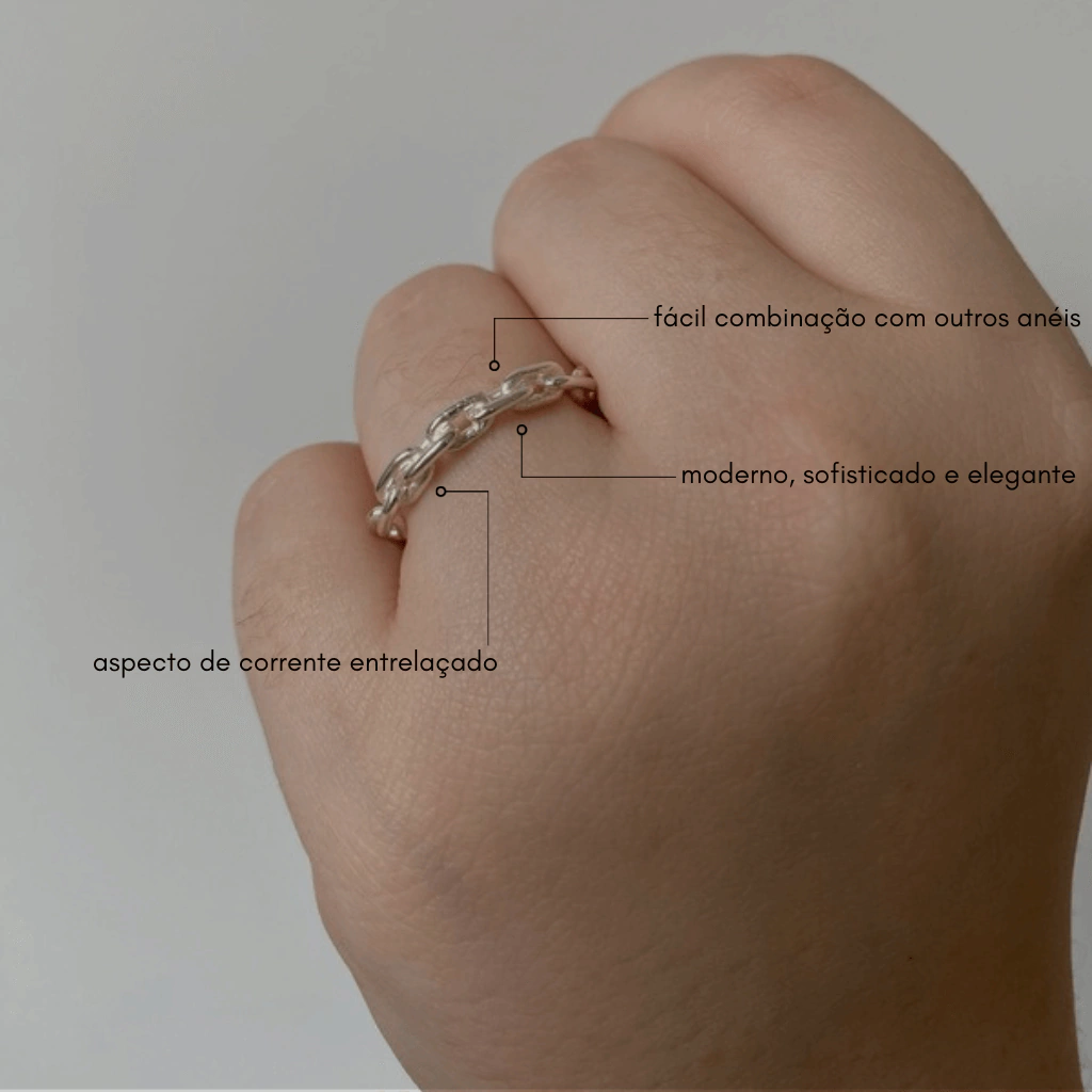 O Anel Corrente é puro estilo com um toque moderno e despojado! Feito em Prata 925, ele traz o design de elos entrelaçados que dão um ar urbano e sofisticado ao visual. Além de lindo, é hipoalergênico, garantindo conforto e segurança para sua pele.