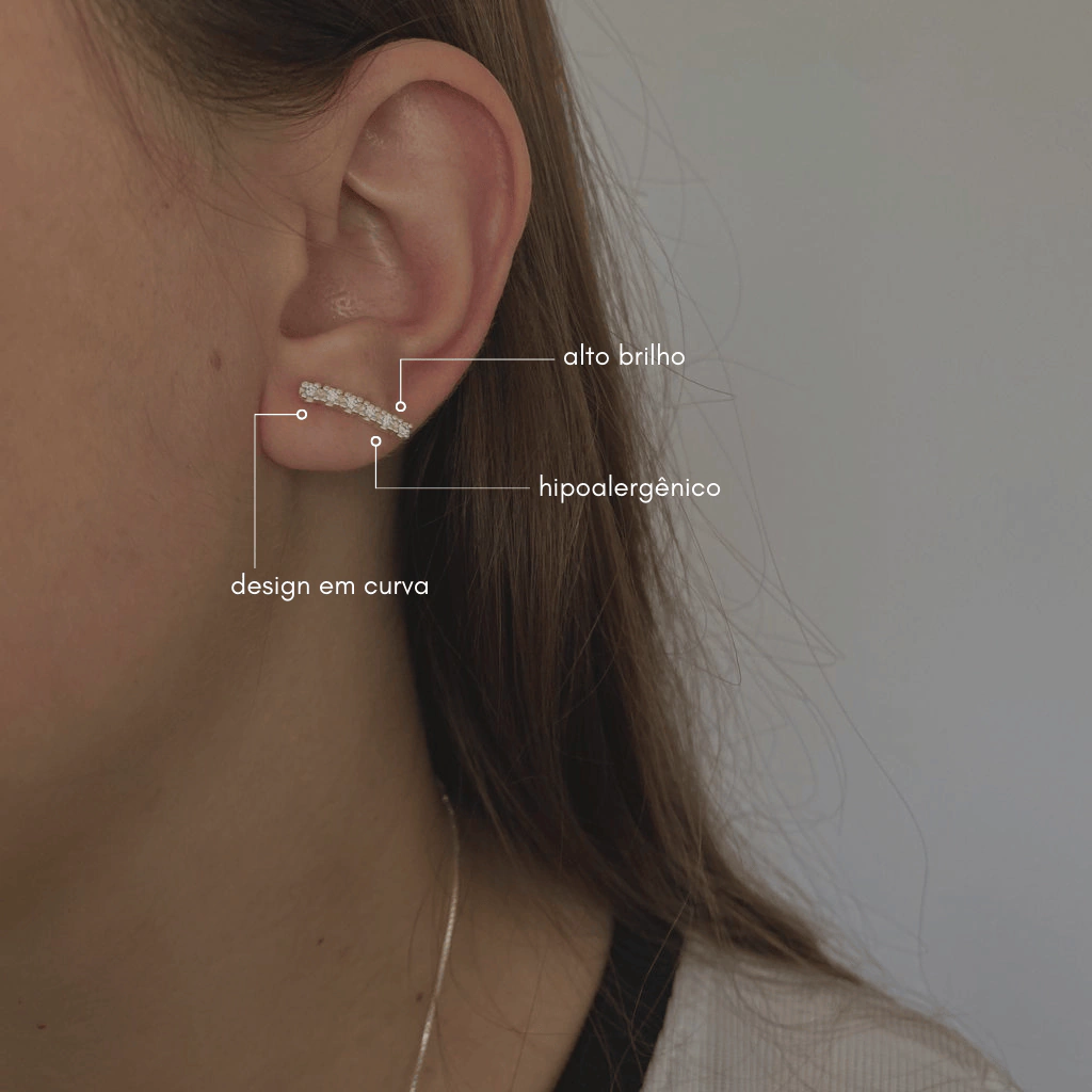 Com 15mm de diâmetro, esse brinco é perfeito para o dia a dia, trazendo um toque de elegância sem exageros. A curvatura cravejada de zircônias reflete a luz de maneira sutil, tornando a peça ideal para quem adora um brilho elegante e moderno.